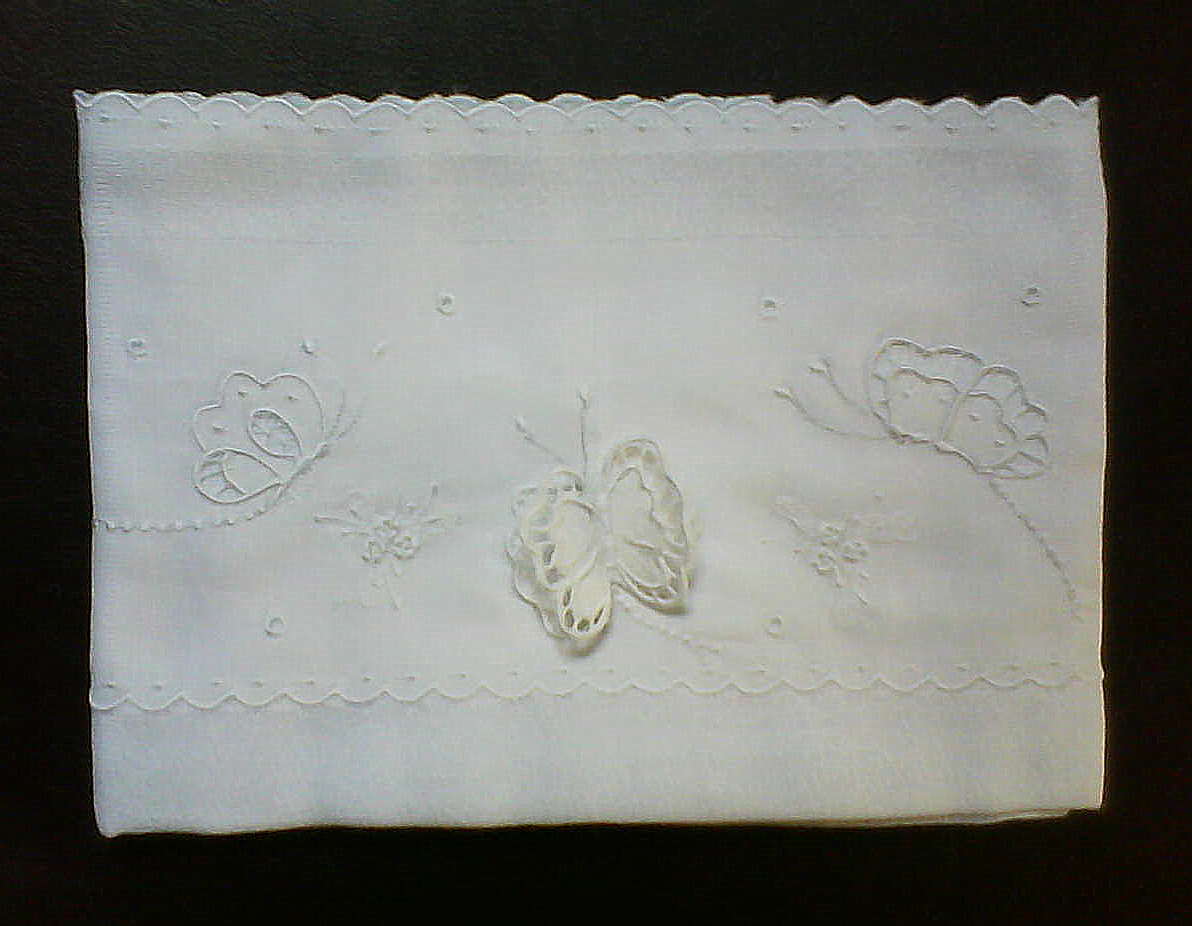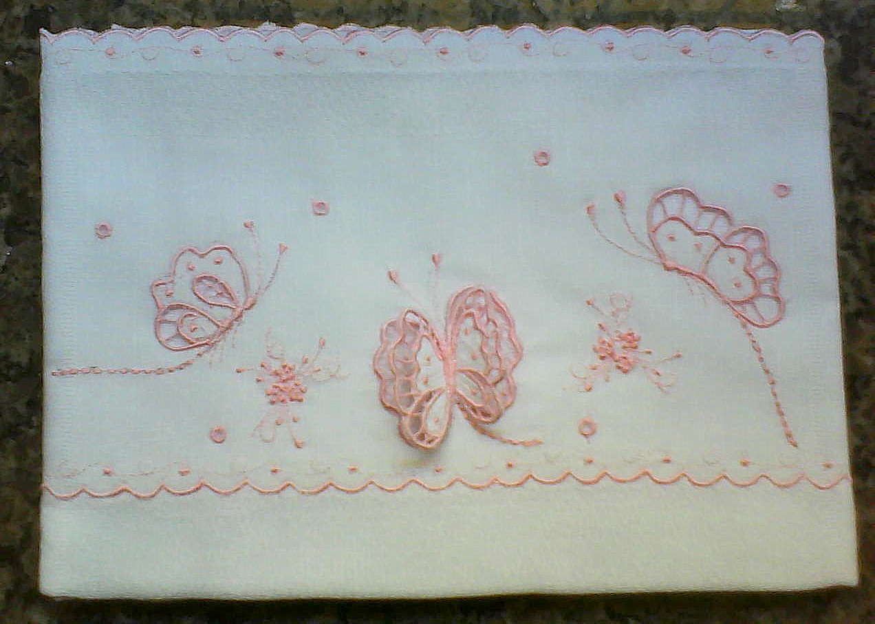 | Manta borboletas em piquê com bordado em crivo na cambraia de algodão (faz jogo com vira manta, mas pode ser vendida separadamente) R$ 197,90 cada manta |
